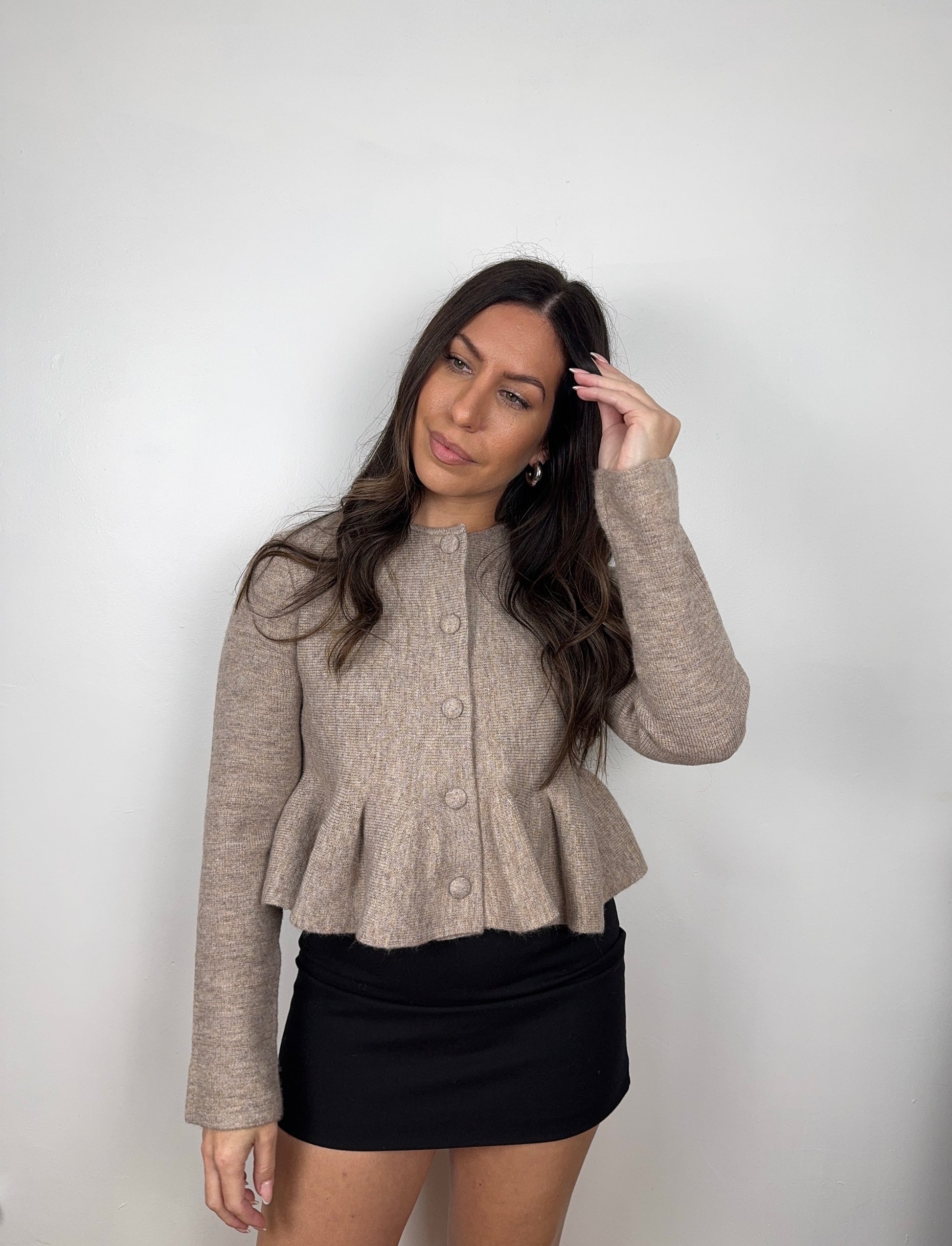 A sweet spin on a classic cardigan. The Meredith Cardigan features a cozy Mocha hue and a peplum flare at the hem, creating a playful, feminine finish.